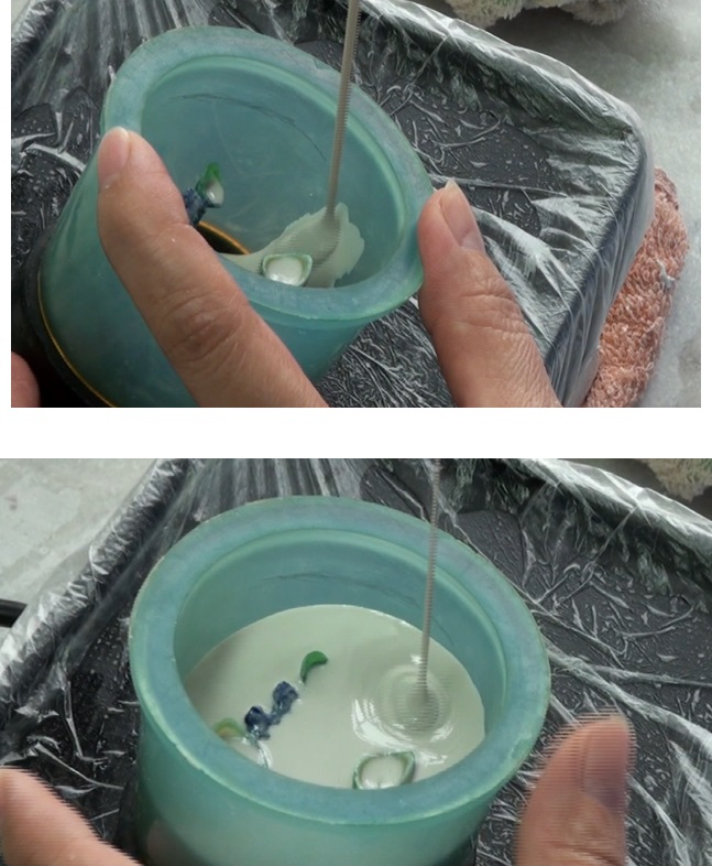 3、先將調好的混合液倒進(jìn)攪拌杯,再將包埋粉倒入杯中,開(kāi)始真空攪拌。真空攪拌時(shí)間60秒。如果沒(méi)有真空,鑄件表面則可能會(huì )有小氣泡附著(zhù)。